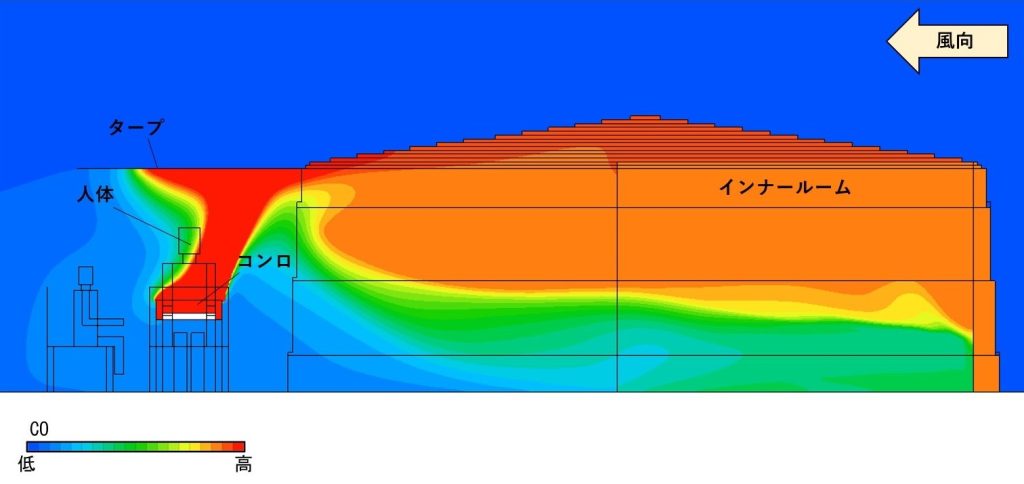 気流解析の結果、屋外で発生した一酸化炭素がテントの奥まで流れ、天井付近の高い位置だけでなく、人の頭の高さ程度の低い位置にも滞留することが明らかになりました。