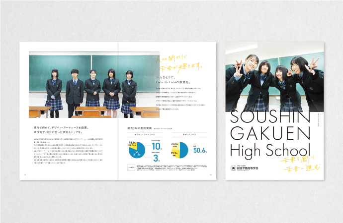 創進学園高等学校様は生徒一人ひとりに寄り添った教育を推進しており、その中でのびのびと学ぶ学生達をモチーフとして、学校生活が感じられるビジュアルを目指しました。